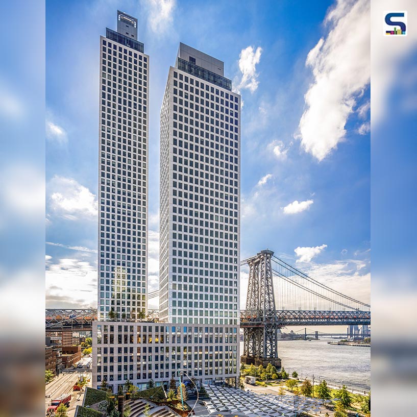 The building's fourth to sixth floors house amenities like an indoor pool, sauna, cold plunge, and outdoor pool deck overlooking the Williamsburg Bridge. The skyscrapers' design followed a masterplan by SHoP Architects and Two Trees Management.