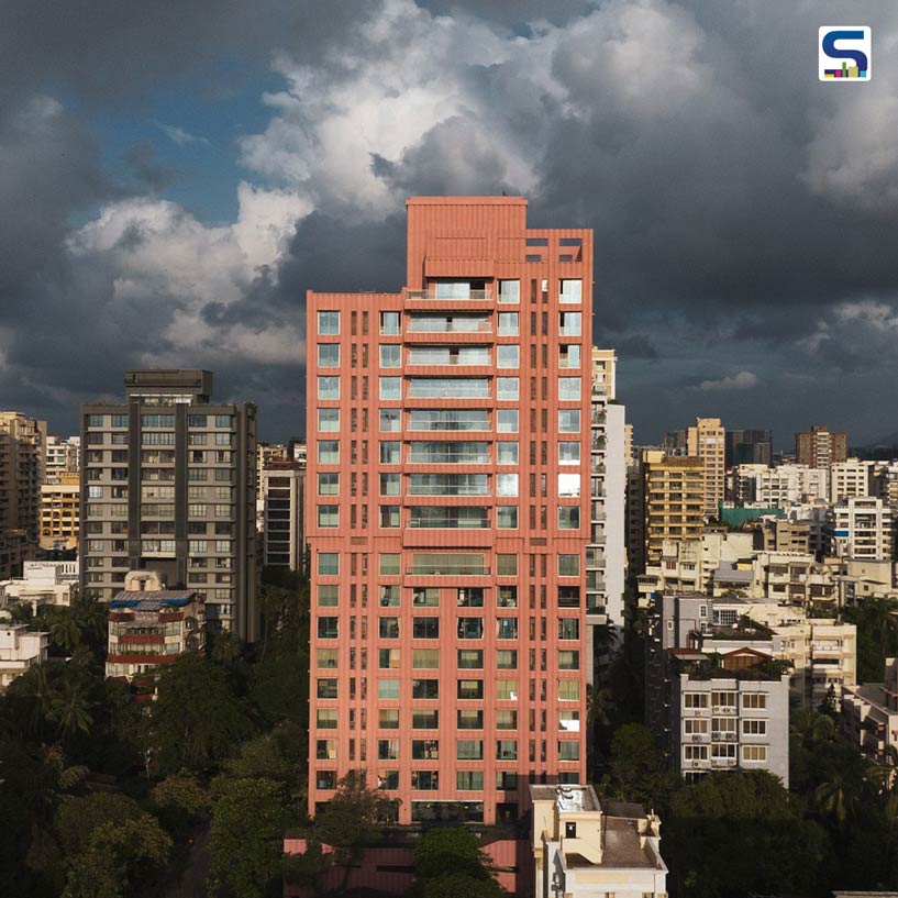 A striking design feature of the building is its pink fluted concrete facade, purposefully chosen to stand out against the typically grey-toned buildings surrounding it. The colour draws inspiration from India’s national flower, the lotus, thus creating a sense of cultural symbolism and softness into the urban fabric. The fluted surface also plays a functional role, helping regulate the interior temperature by forming a thermal buffer between the external climate and the apartments within. In some areas, the walls thicken to almost one foot before tapering back, thus passively enhancing thermal comfort while lending texture and depth to the exterior. This fluted envelope more than just the aesthetic. It responds directly to Mumbai’s hot and humid climate, offering an innovative passive design strategy that improves indoor comfort without relying heavily on artificial cooling systems.