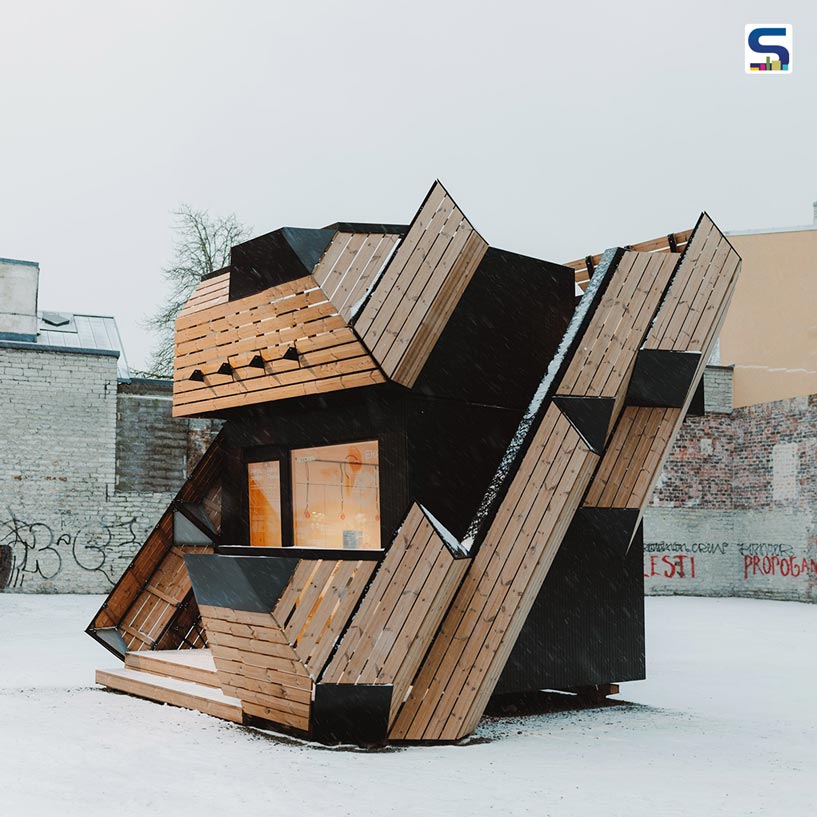The pavilion’s distinctive angular form derives from the sLender facade system, which was initially designed as a response to the pressing issue of upgrading Estonia’s ageing housing stock.
