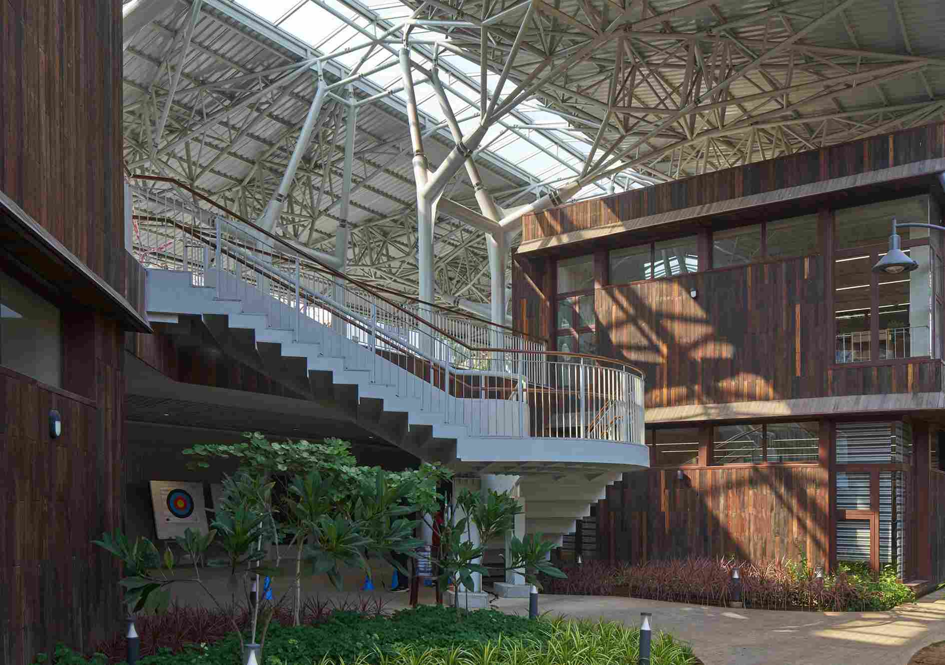 According to the team, the inspiration for the project came from Chennai’s tradition of verandas and semi-covered learning spaces. Historically, verandas have served as thresholds between inside and outside, spaces where air, light and community converge. At Shiv Nader School, this vernacular idea is reinterpreted at scale where the roof creates a continuous veranda-like environment where birds, animals and students coexist in an ecosystem of learning.