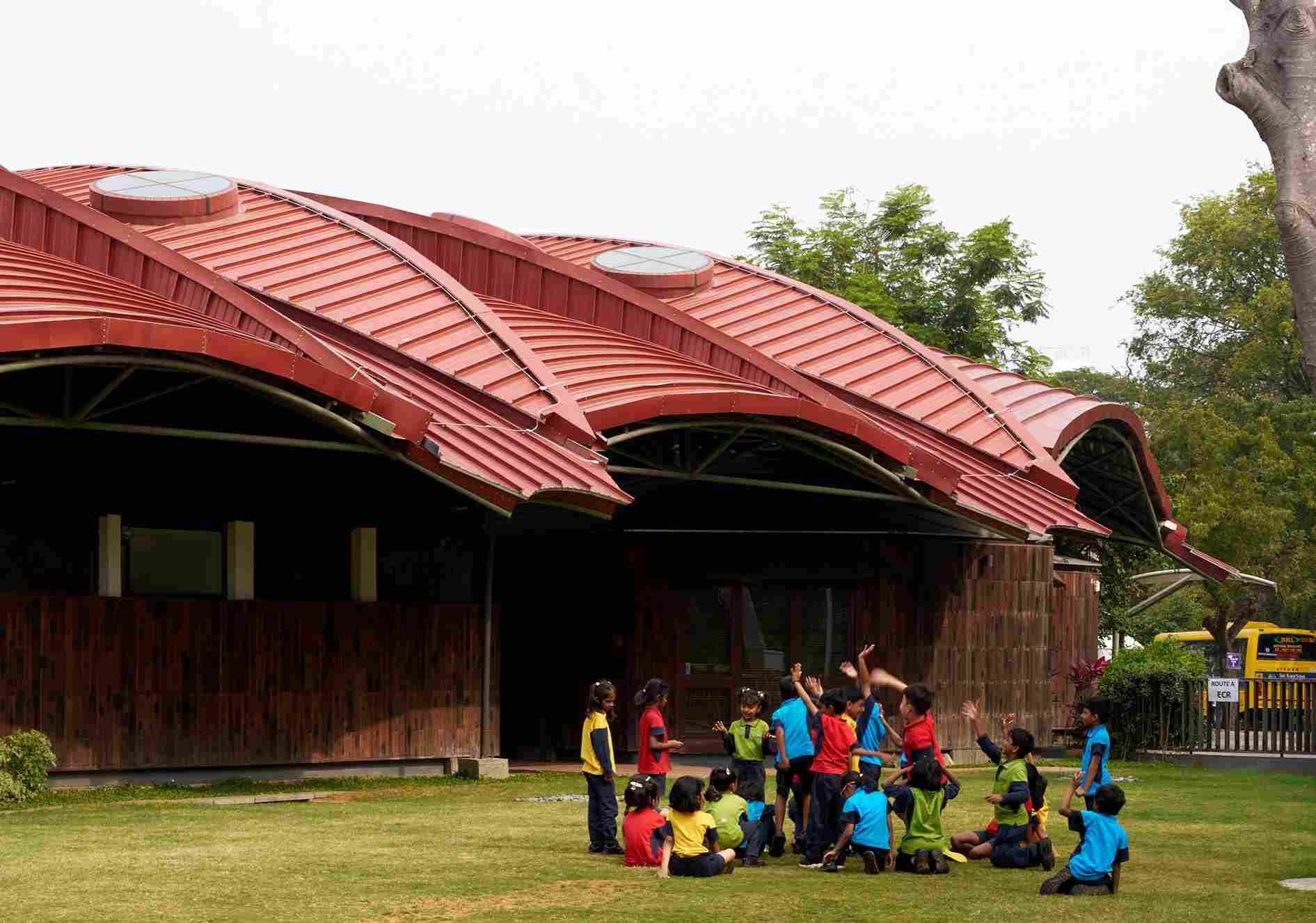 At the heart of the Shiv Nader School project is a striking red aluminium roof, its sweeping, undulating form inspired by the overlapping banana leaves that dominate the local landscape.