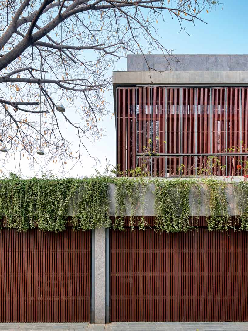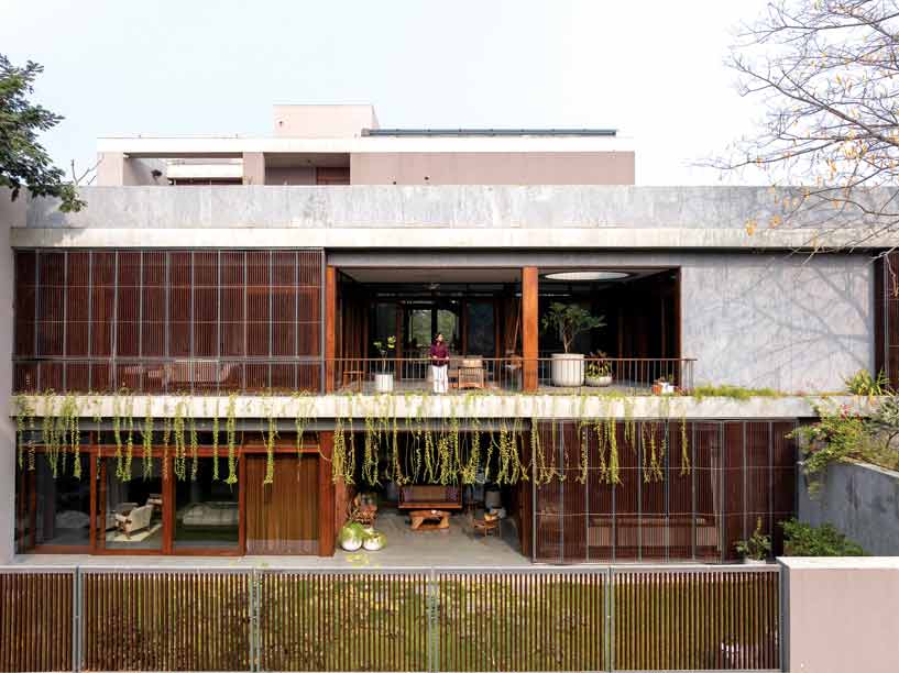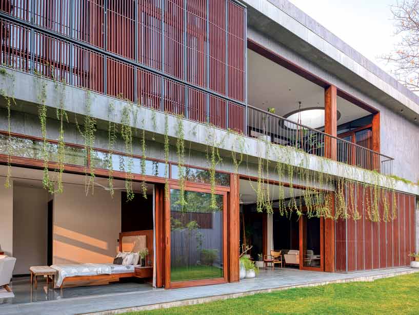In Ahmedabad’s harsh climate, The Open House by PVDRS (Patel-Vadodaria Design Research Studio) stands as a thoughtful response that marries passive design with material innovation. However, the home’s facade plays a pivotal role in balancing transparency and privacy. While the west-facing side is protected by thick cavity walls to reduce heat gain, the east, south and north elevations embrace the outdoors with full-height sliding-folding screens. Drawing inspiration from traditional jaalis (stone screen) found in Islamic architecture, these screens reinterpret the concept through a minimalist, contemporary lens. Made from vertical slats of eco-friendly, natural fibre composite, they offer a sustainable alternative to wood, which is lightweight, renewable and durable.