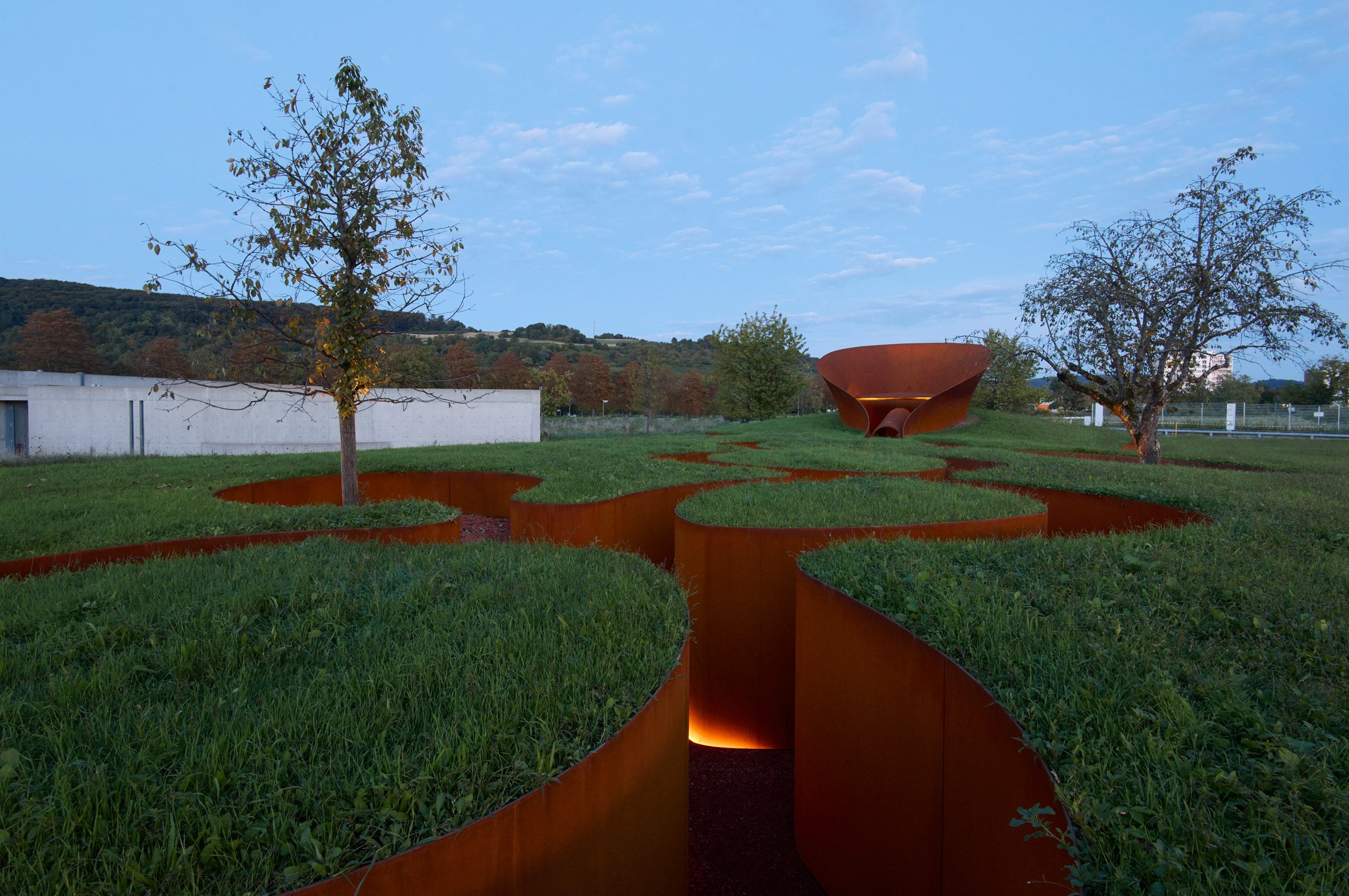 Set on a quiet plot adjacent to Tadao Ando’s Conference Pavilion, the Doshi Retreat emerges as a snake-like form crafted from weathered steel, gracefully blending into the landscape of Vitra’s iconic architectural ensemble. Unlike the more public and striking buildings on the campus such as Zaha Hadid’s Vitra Fire Station, Frank Gehry’s Vitra Design Museum or Herzog & de Meuron’s VitraHaus, Doshi’s creation is introspective and almost hidden, intended as a space for solitude, reflection and spiritual retreat.
