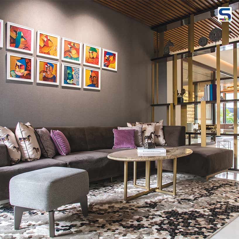 Breaking away from conventional modern or classical façades, the elevation employs subtle angles, tapered surfaces, and layered detailing. A restrained beige and brown palette, along with 3mm solid porcelain tiles in matte and gloss finishes, ensures both durability and understated elegance. Strategically designed coves enhance the façade’s aesthetic while aiding in maintenance and evening illumination. The interiors unfold with a welcoming foyer dressed in beige veneer paneling and a thoughtfully laid flooring pattern that unifies wall surfaces and door faces throughout the home. Gold and turquoise accents are subtly woven into lift panels, entrance rugs, and art pieces, while bold abstract artwork energizes the transitional corridors. A circular fireplace anchors the living room, accompanied by a bar area with an onyx backdrop that transitions from refined by day to vibrant by night. Rich shades of rust, wine, and orange in the furnishings amplify the home’s warm, contemporary atmosphere.