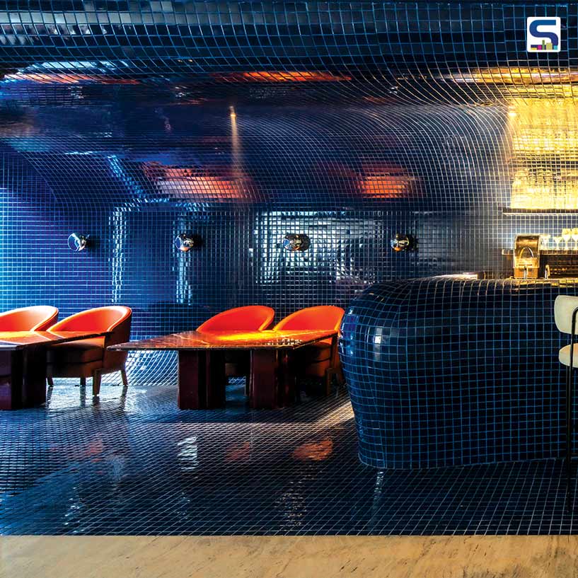 This restaurant by Studiio Dangg features a striking contrast in materials and forms. One side features deep navy Piccolo Mosaics flowing seamlessly across the floor, walls, and ceiling, creating a blurred, continuous look. The opposite side, clad in locally procured travertine, showcases sharp geometric precision with 3D CNC cut HDHMR tiles and matching square proportioned flooring, emphasizing structure and definition. Locally sourced and fabricated MS sections on the terrace, finished in wood texture paint, complement the design.