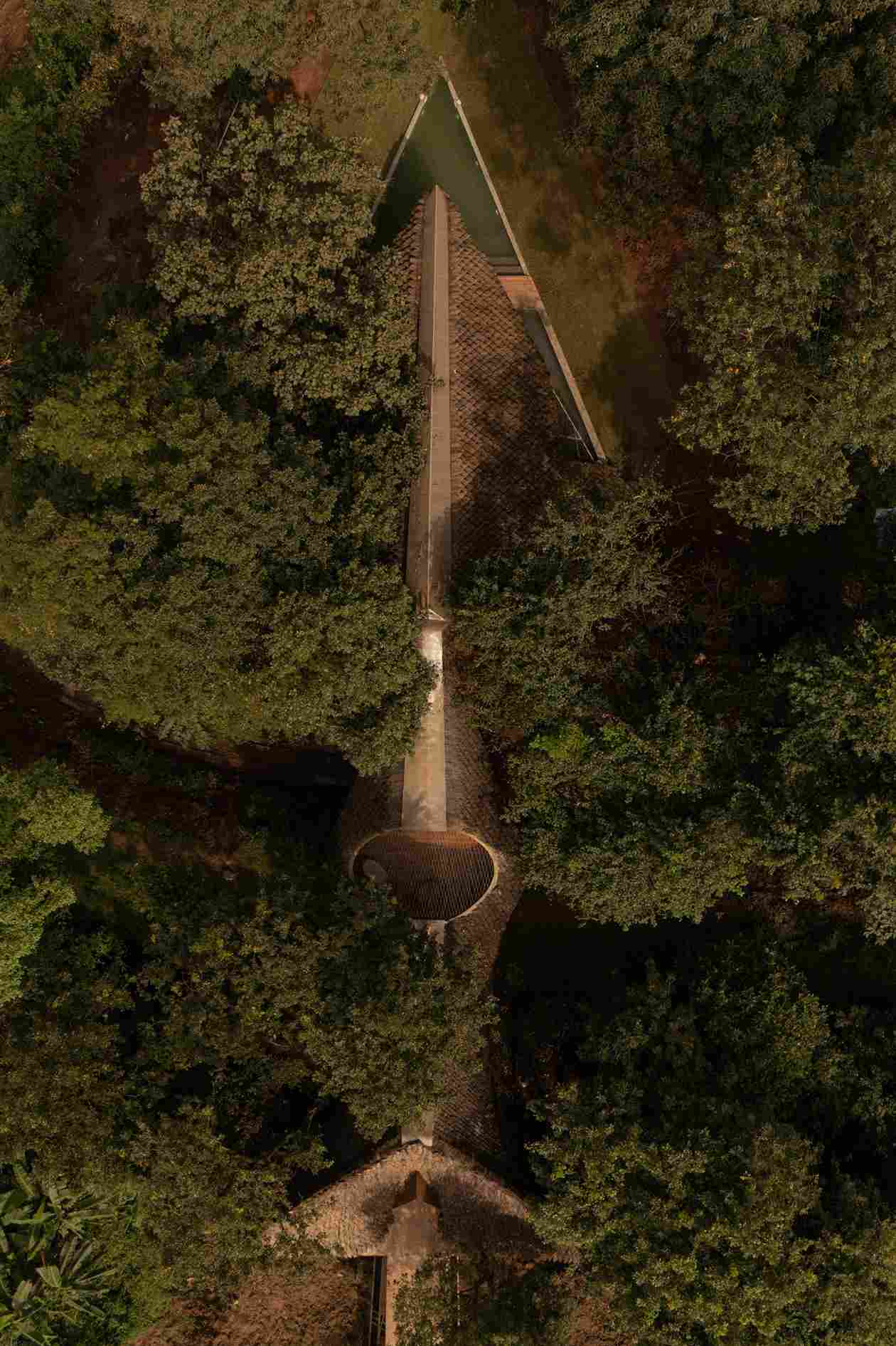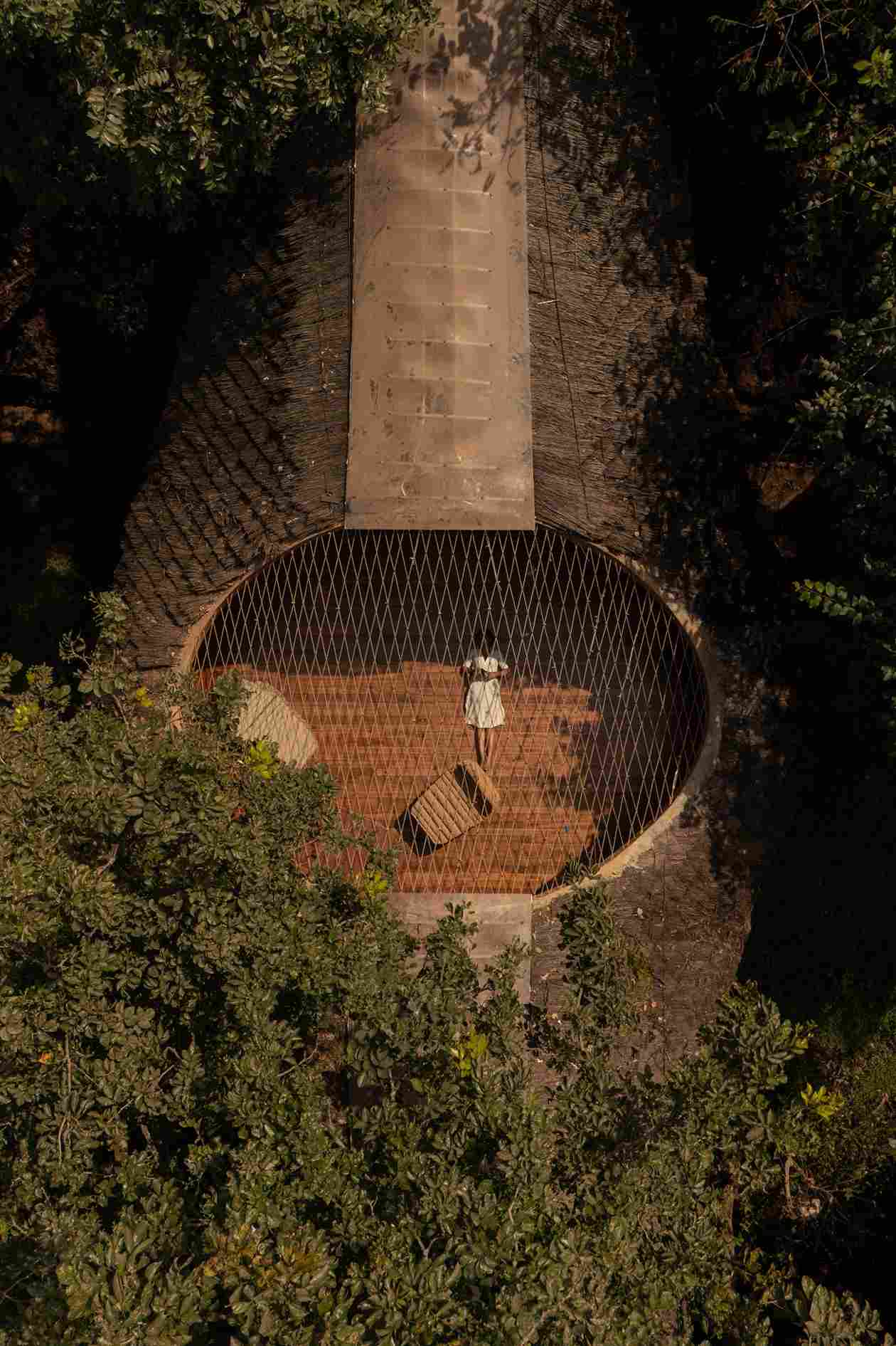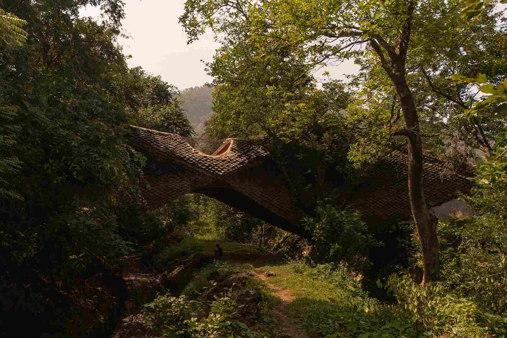 Floating between trees inside the gorge, the bridge appears like a giant cocoon woven into the forest canopy. Its cladding, inspired by the overlapping scales of a pangolin, uses locally available grass laid over steel cable grids and finished with mud plaster. The thatch provides excellent thermal performance, while the mud layer acts as a protective barrier against rodents and insects. This is something that the team has to keep in mind as it was an essential improvement considering how pest invasions have historically caused thatched roofs to fall out of favour.