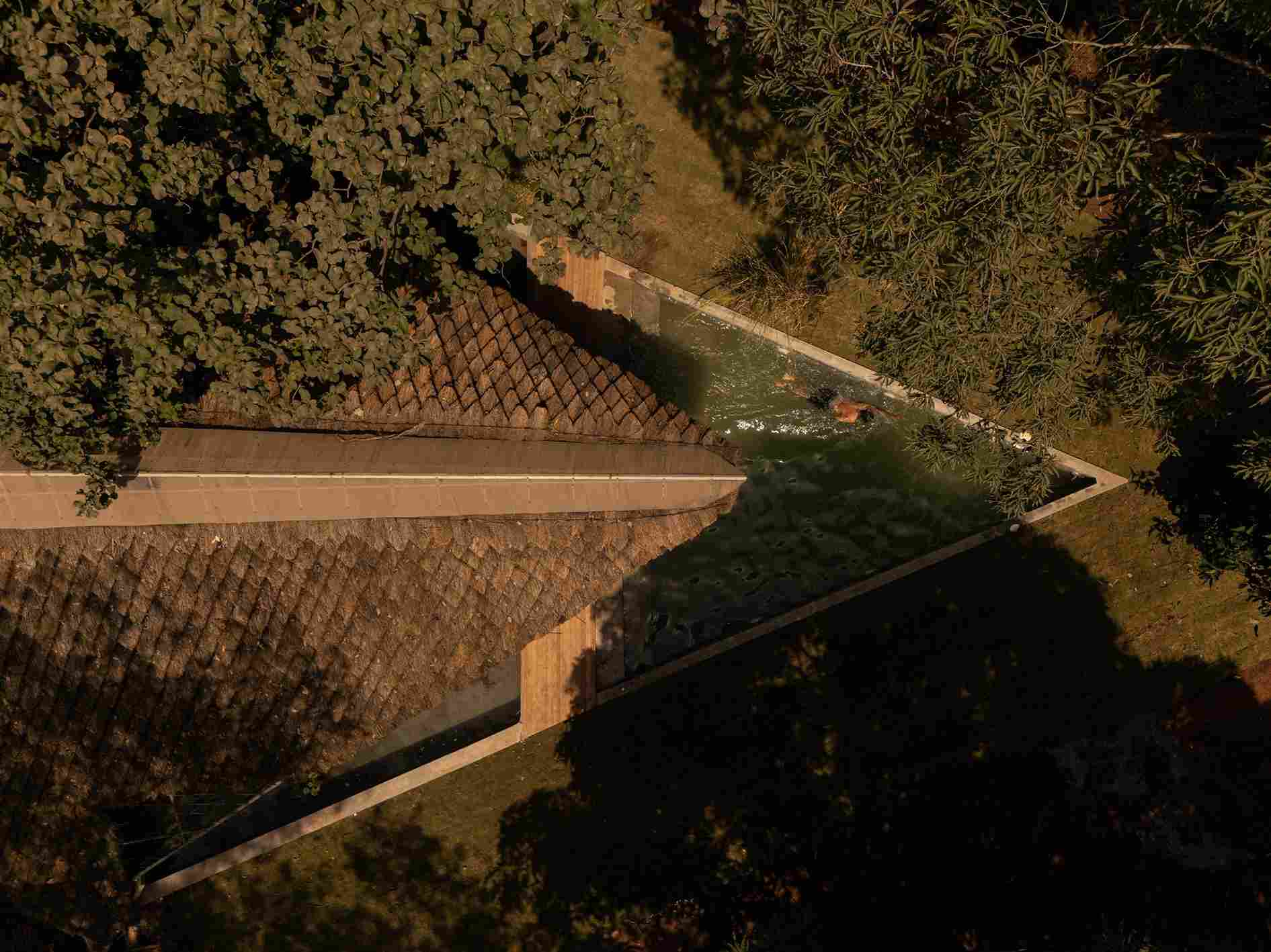 The central span of the Bridge House forms an elongated living area crowned by a generous open oculus. This circular cut-out becomes the heart of the home, drawing in light, sky and allowing rain to fall directly into the interior courtyard. At either end of the bridge, two angular, two-storey volumes accommodate bedrooms that open to views of the forest and the stream below. A glazed, prow shaped volume extends outward, containing the kitchen and dining area and overlooking a triangular swimming pool nestled into the landscape.