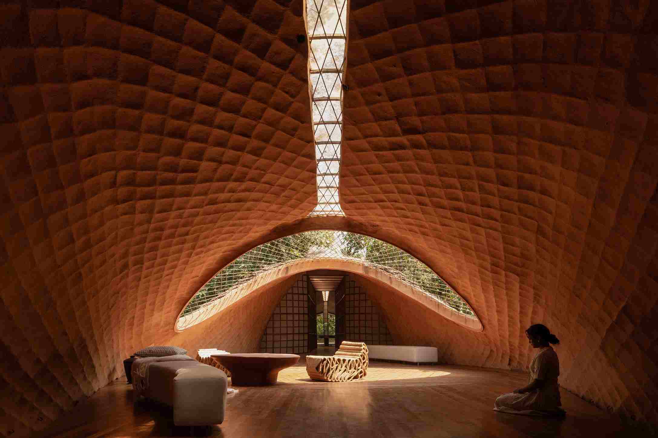 These restrictions ultimately became the means for innovation. Architecture studio Wallmakers conceived the Bridge House as a 100ft long habitable suspension bridge crafted from four hyperbolic parabolic forms. The primary structure used minimal steel pipes, beams and tendons to provide tensile strength, while a composite of mud and local grass thatch contributed compressive strength, insulation and environmental integration. The brief had called for a substantial 418sqm home with four bedrooms, yet even transporting basic materials to the remote site was a major challenge for the team. This logistical limitation pushed the team toward a design that relied heavily on what could be sourced nearby, thus resulting in a lightweight structure resting on just four footings. This approach allowed the natural contours of the land to remain largely undisturbed.