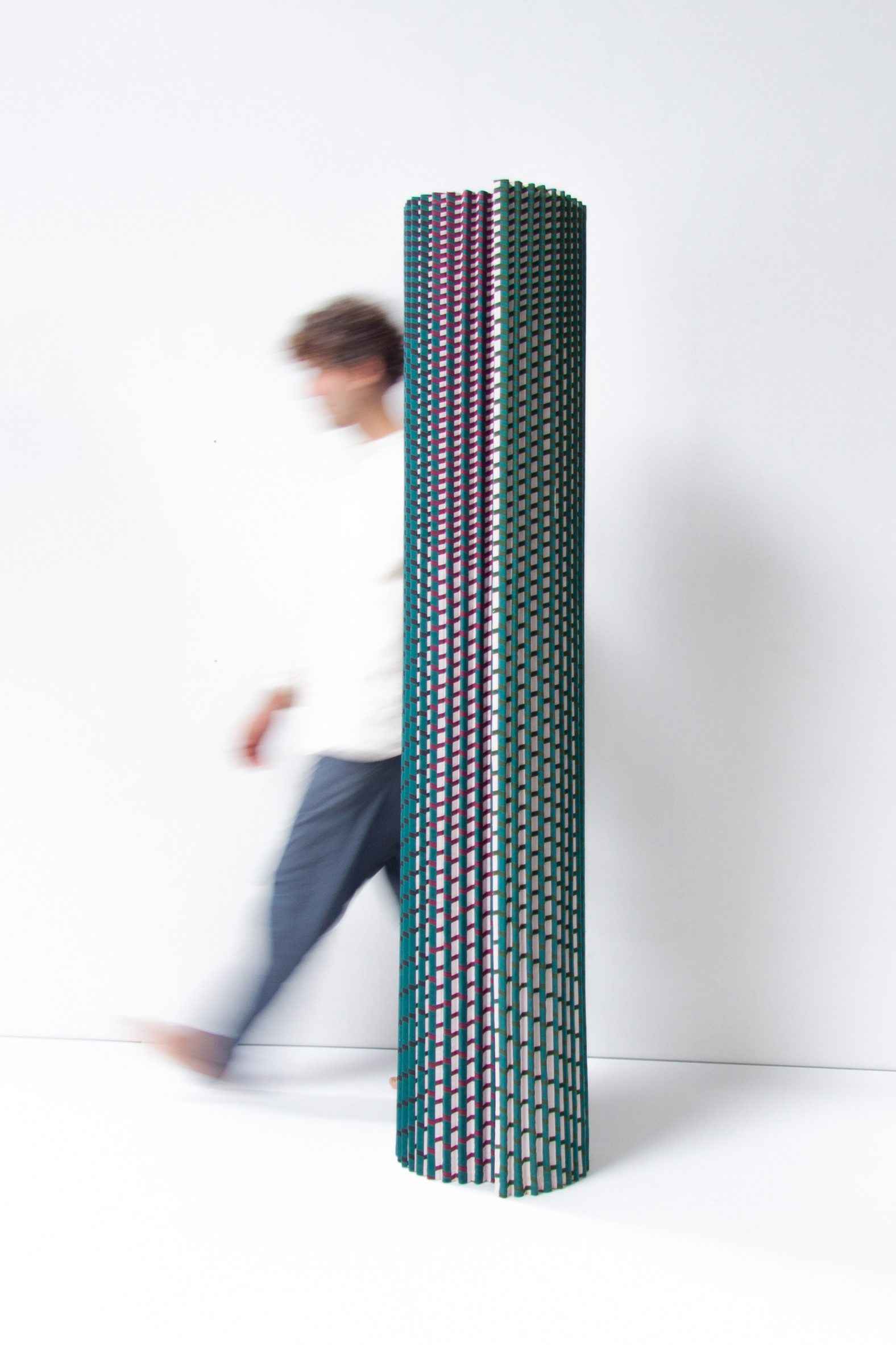 A key innovation lies in how the two layers interlock. They fold into a sequence of hollow, diamond-shaped tubes that provide both structure and acoustic performance. These tubular forms also allow the divider to be easily taken apart at the end of its life, reinforcing the design’s circularity. According to Luis Marie, the construction method borrows techniques from the fashion industry and automotive upholstery but applies them in a novel architectural context. By avoiding glues, resins or rigid inserts, the piece remains fully recyclable and simple to disassemble, supporting closed-loop material use.