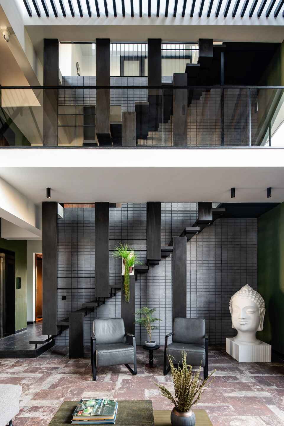 Packed with concrete and finished with large vitrified tiles featuring chamfered edges, the staircase presents itself as a monolithic piece of art.