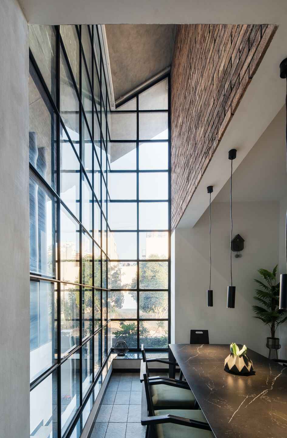 As one steps inside Kodalli’s Happy Place, an inviting olive-toned foyer sets the mood, unfolding into a double-height living area which is defined by exposed brick surfaces, wooden rafters and an impeccably detailed cantilevered staircase. The connection to the outdoors is preserved through large glazed surfaces that draw the eye toward the garden, ensuring the interior remains visually open and grounded in nature.