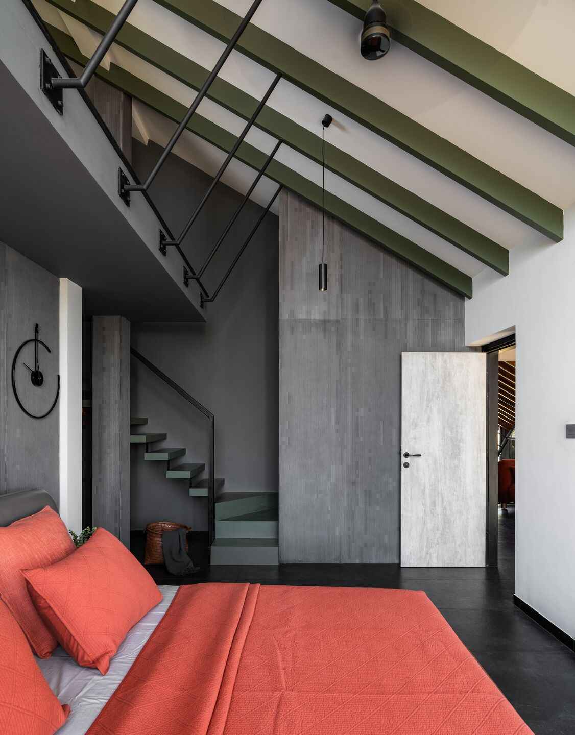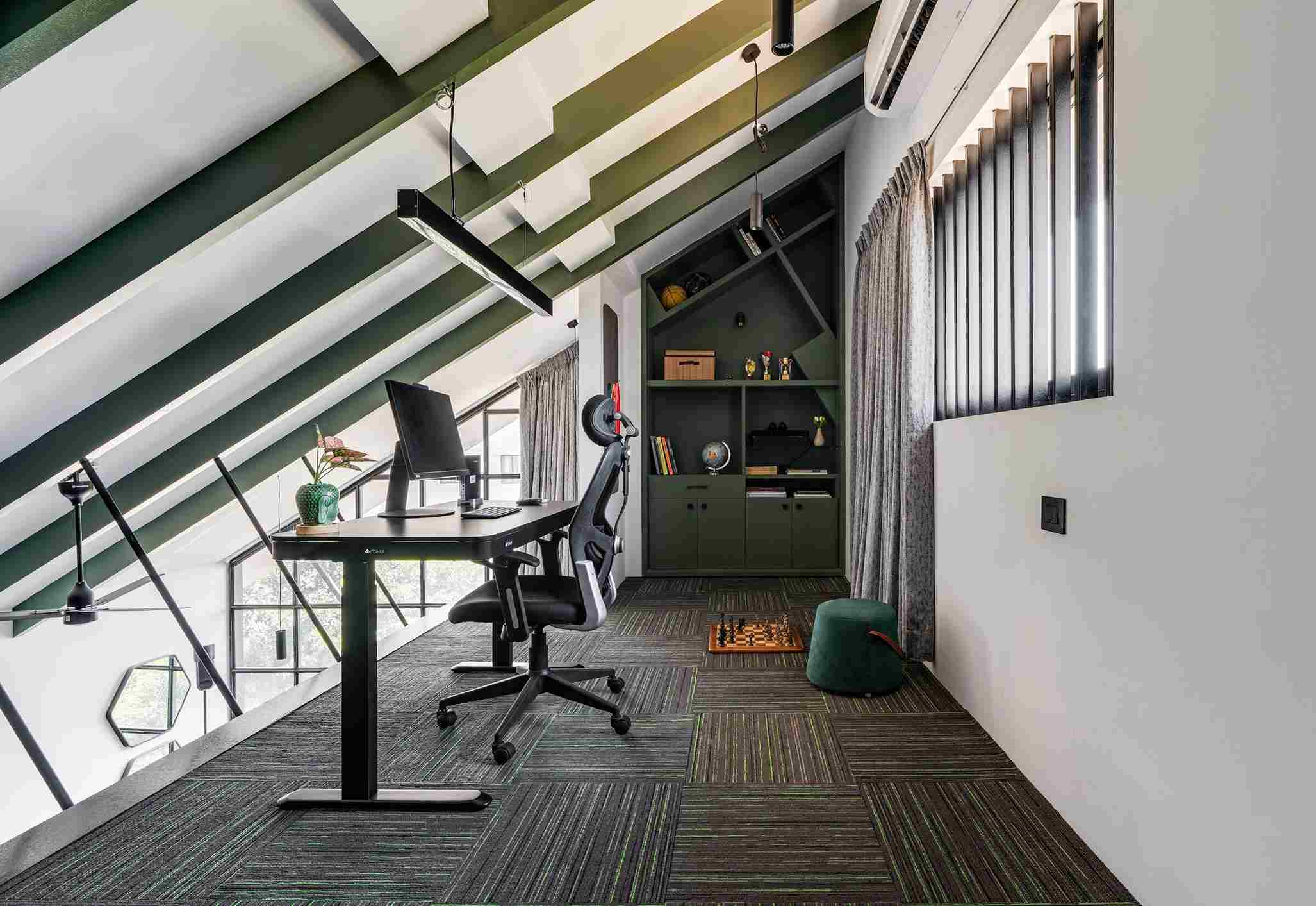 Ascending to the first floor, one encounters the family lounge, which is an informal zone designed for spontaneous conversations, leisure and quiet bonding moments. Overlooking the garden, it acts as a transitional space that connects the private areas of the home while still retaining an intimate atmosphere. The children’s bedroom, tucked beneath the sloping roof, is designed as a bright and spirited environment. Its unique geometry gives it a sense of enclosure without compromising openness. Carefully positioned windows usher in natural light, accentuating the playful slope of the ceiling. A thoughtful study nook encourages reading, learning and reflective space, making the room both functional and deeply personal.