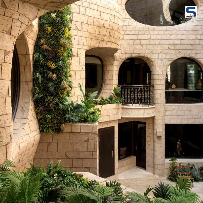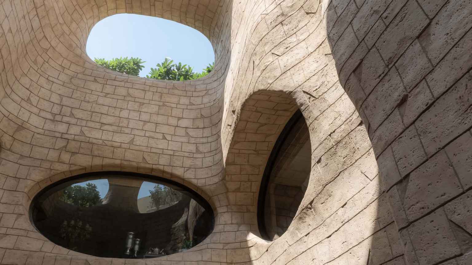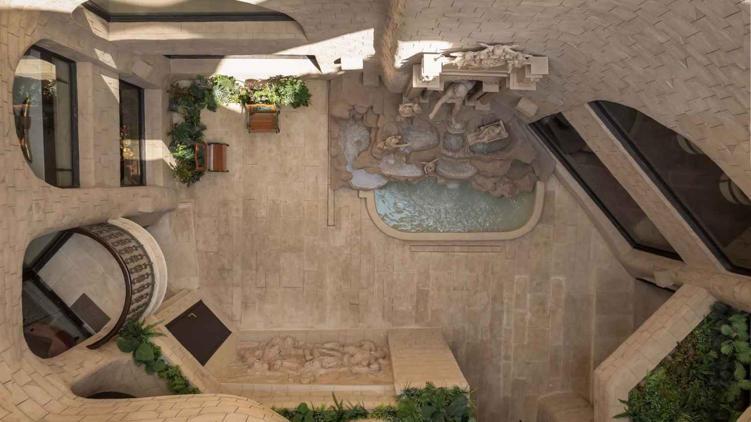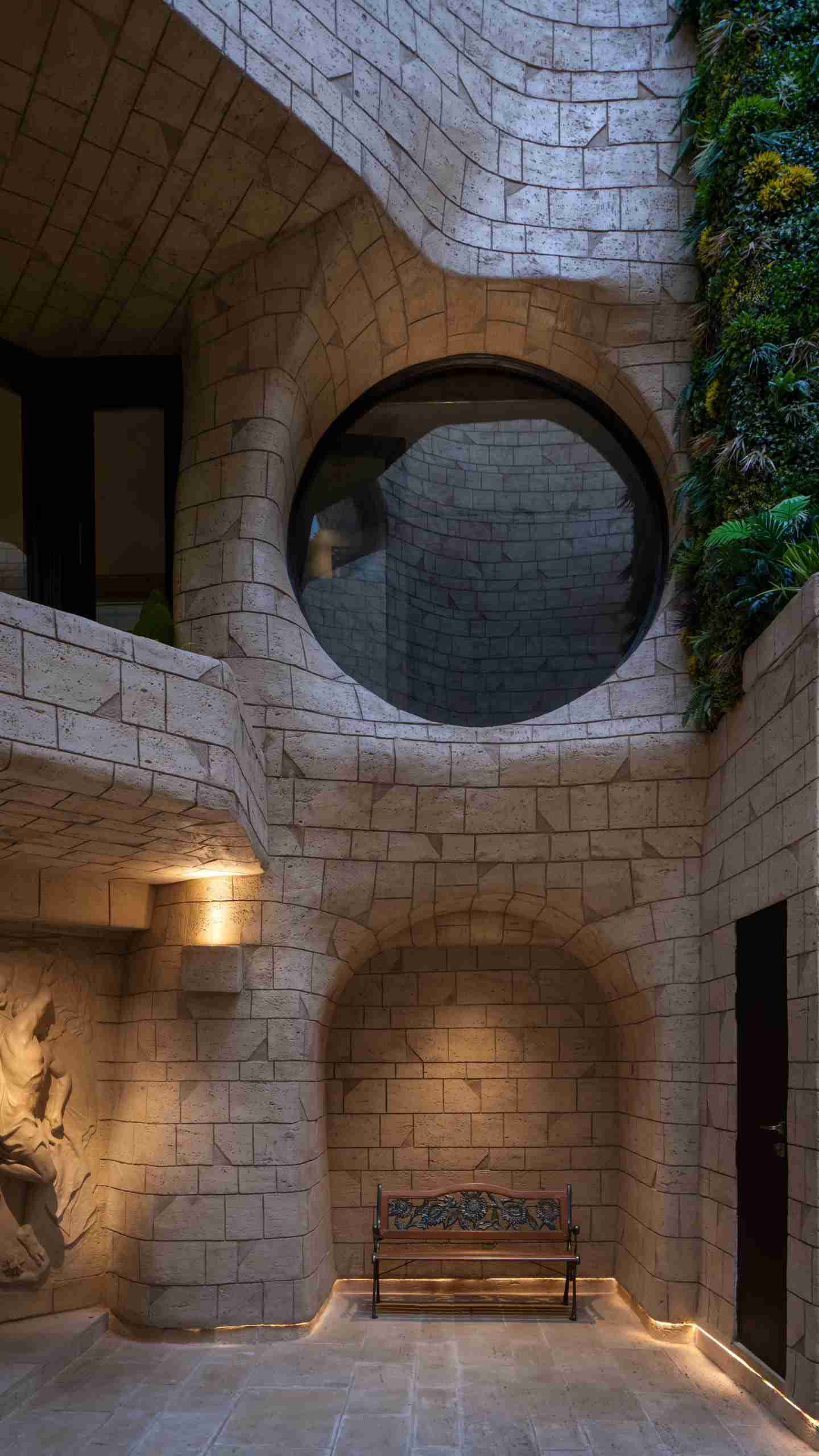 M:OFA anchored the lower level of the residence in classical symmetry, echoing traditional Renaissance courtyards that rely on proportion and balance. As the structure rises, this order gives way to a more free-flowing, undulating stone surface that wrap around the vertical space. Across three storeys, the courtyard shifts from a disciplined ground plane to increasingly sculptural volumes, connecting each level visually and spatially. Balconies on the upper floors overlook the fountain, and a set of oculi punctures the domed ceiling to compose the movement of natural light throughout the day.