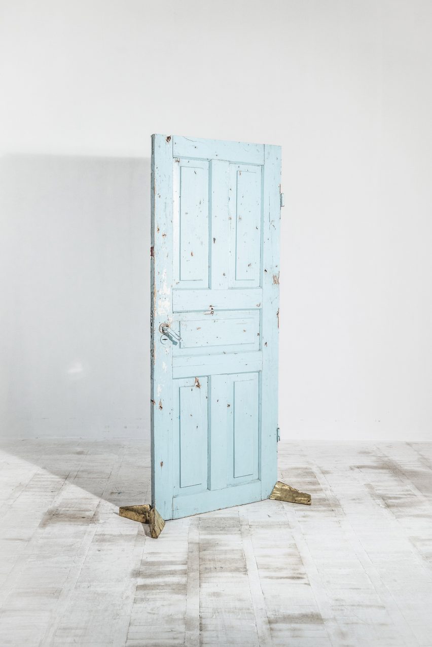 Another sculpture presented a battered door, still marked by missile impacts, supported by a pair of brass feet made from recast shell casings.