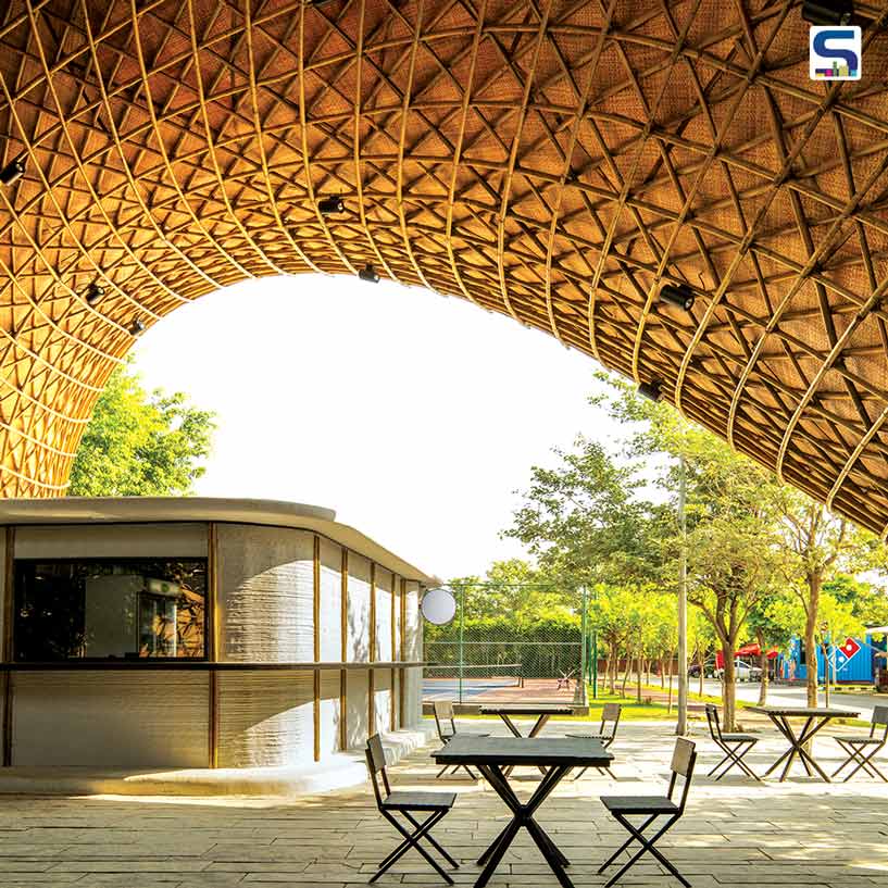 The facade and built elements are anchored by 3D-printed concrete kitchen modules, inspired by food trucks and executed by Micob Pvt Ltd, Ahmedabad. These modular units form a robust yet efficient frontage, with the additive printing process reducing material waste, energy consumption and construction time. The cavity walls of the printed concrete further enhance the facade’s thermal performance, thereby improving comfort while lowering heat gain. Hovering above, the defining visual layer is a bamboo gridshell canopy that functions as both a facade and a shading device. Curving in two directions, the bamboo shell mirrors the efficiency of folded leaves, achieving strength with minimal material. Spanning up to 19m, the structure comprises four layers of slender bamboo members laid at 45 degrees and f inished with crushed bamboo mats.
