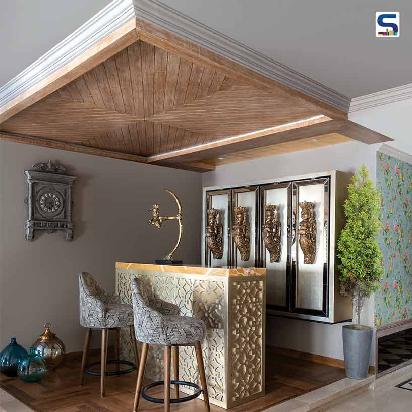 Rooted in Victorian elegance and Indian heritage, The House of Jewels is a 4,000 sq ft residence in Kanpur, layered with a rich palette that balances opulence with warmth. Carved solid wood forms the backbone of the interiors, appearing in the grand entrance door, archways, four-poster beds, and bespoke furniture. Marble flooring provides a foundation for the public spaces, while hand-painted murals, antique curios, and sculptural artifacts introduce patina and narrative, allowing walls to function as canvases of memory. In the dining area, the interplay of polished stone, fabric drapes, and metallic detailing heightens the sense of ceremonial grandeur.