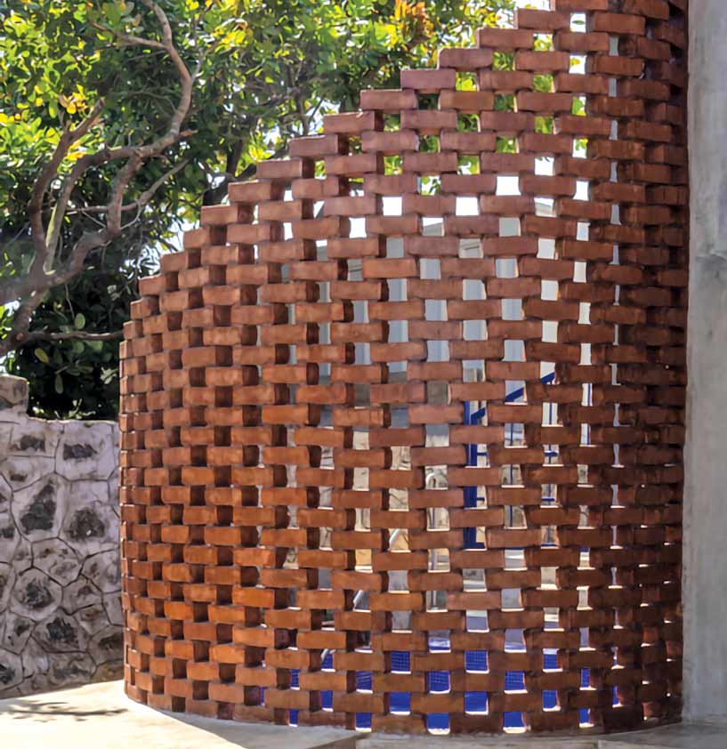 A wavy brick wall wraps the plunge pool, acting as a porous boundary that balances privacy with openness. Complementing this is a crinkle-crackle garden wall. Its snake-like form uses fewer bricks while gaining strength through curvature with pockets planted with cactus that thrive on retained heat.