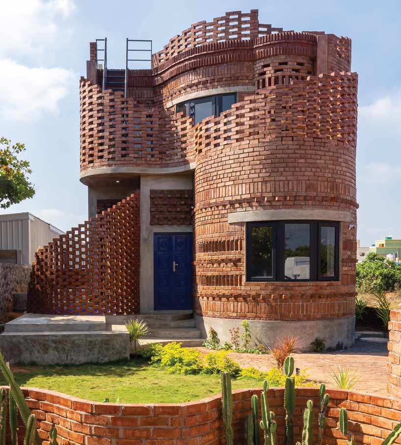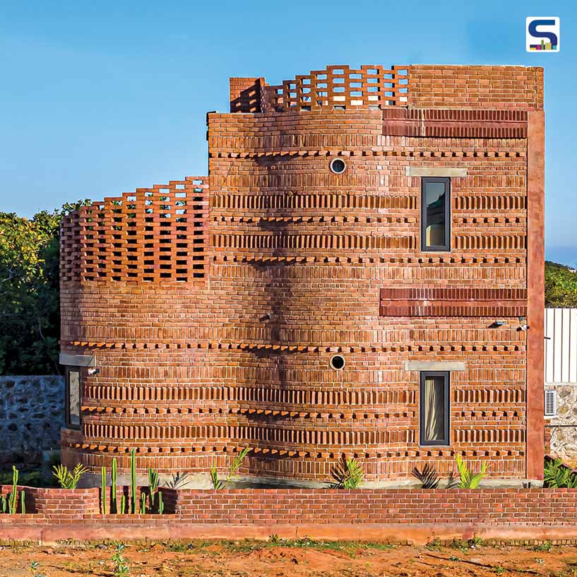 Occupying a compact footprint of 1,200 sqft, the House of Dancing Cactus in Pondicherry features a bold, sculptural facade that transforms humble brick into an expressive architectural skin. Designed by Chennai-based studio Art & Architecture, the two-storey guest house draws inspiration from the town’s coastal landscape, translating the rhythm of sea waves into a sinuous, undulating brick envelope. Locally sourced exposed bricks are laid in unconventional patterns, deliberately breaking the rigidity of standard masonry. Crafted by skilled masons using precise technical drawings, the rippling facade challenges structural norms while enhancing performance.