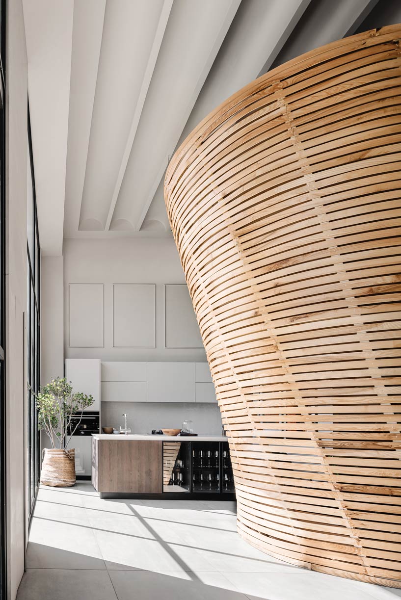 A restrained palette of warm white surfaces forms a quiet architectural shell, against which light oak introduces warmth. Folded metal defines the dramatic floating staircase, adding structural lightness and industrial precision. Cork, steel, and locally sourced wood appear throughout, reinforcing the designers’ commitment to tactile authenticity and regional craftsmanship. Upstairs, glass, wood finishes, and refined wardrobe laminates unfold like curated chapters, presented not as displays but as evolving material narratives. Light and shadow are treated as secondary materials, softening the vaults, accentuating curves, and heightening spatial depth.