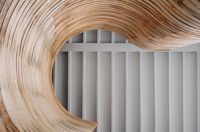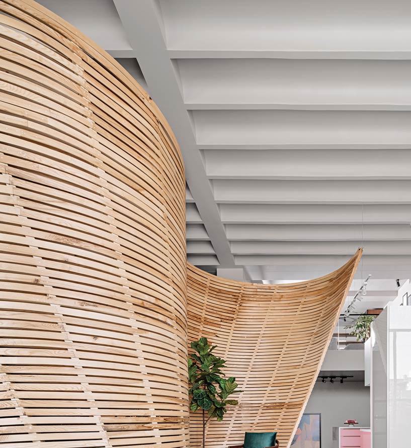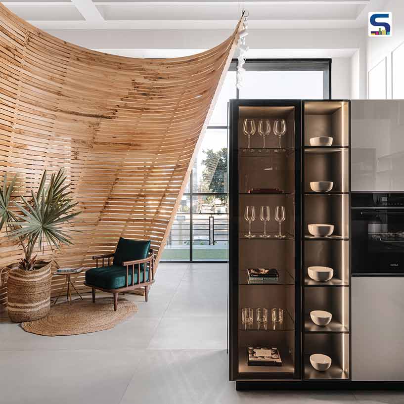 Rather than just showcasing products, the Designest showroom in Indore is anchored by a striking self-balancing sine wave partition that acts as a sculptural spine. Its flowing, textured surface divides the 3,000 sq ft layout while also guiding visitors intuitively, turning circulation into a tactile experience. Around it, walls and floors remain purposefully bare, allowing materiality to take center stage.