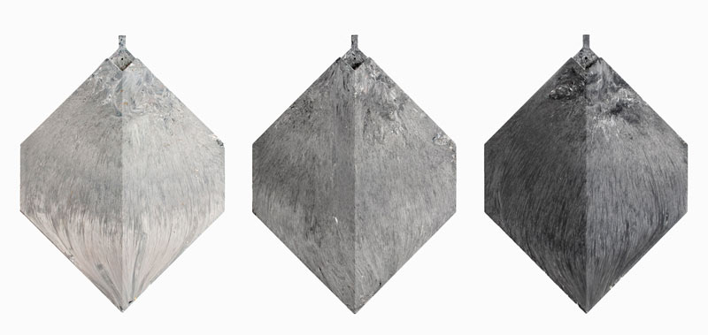 The grey diamond-shaped shingles are made from waste PVC building products such as downspouts, rain gutters, and window frames. The designers suspended them in overlapping rows.