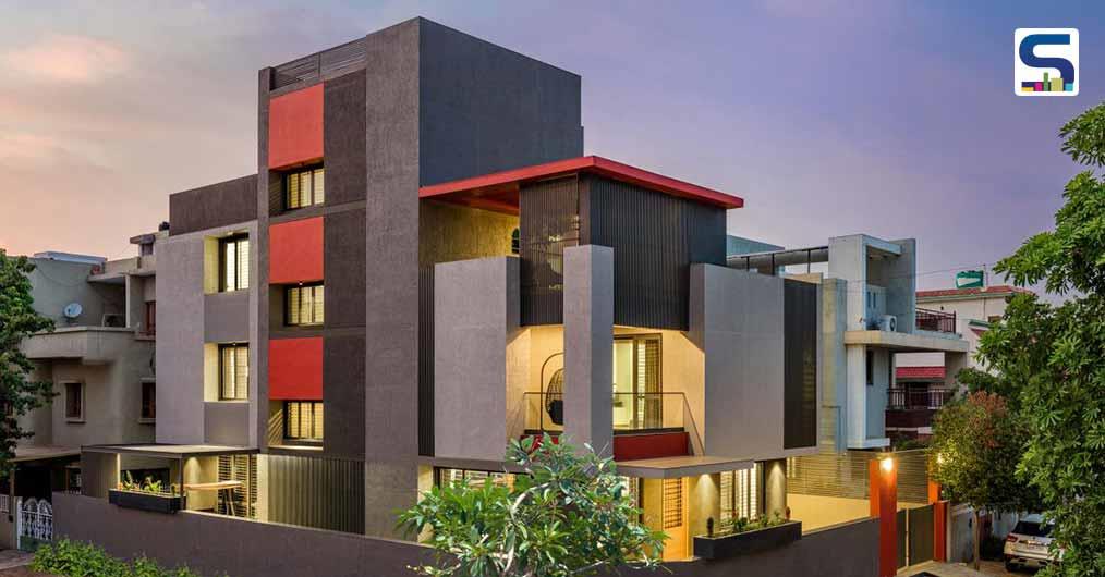 The play of solid grey blocks forming voids at different levels is seen at first glance of the Scarlet House by Ghoricha Associate