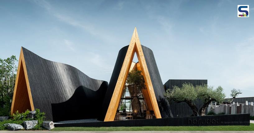 Harudot Cafe, crafted by local studio IDIN Architects in Chonburi, Thailand, features distinctive gabled forms clad in blackened wood, creating a...